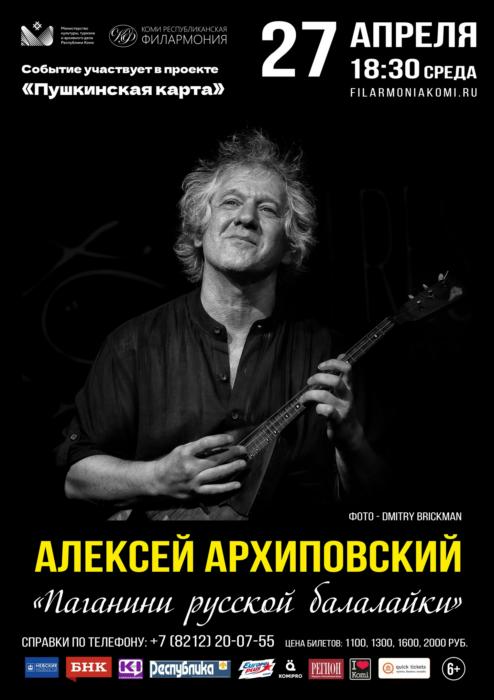 Алексей Архиповский – универсальный музыкант, свободный от стилевых и жанровых рамок, желанный гость на фестивалях классической, этнической, фольклорной и джазовой музыки, а также на концертных площадках, число которых стремительно растет – как в России, так и за рубежом. В 2011 году виртуоз попал в российскую книгу рекордов в номинации «лучший в мире балалаечник». Его нередко сравнивают с Паганини или Хендриксом – музыкантами, которые перевернули сознание слушателей, заставив по-новому взглянуть на возможности скрипки и гитары. Он создал свой собственный стиль игры на балалайке, совмещая аутентичные, гитарные и оригинальные приемы извлечения звука с революционным новшеством — «электрификацией» инструмента.