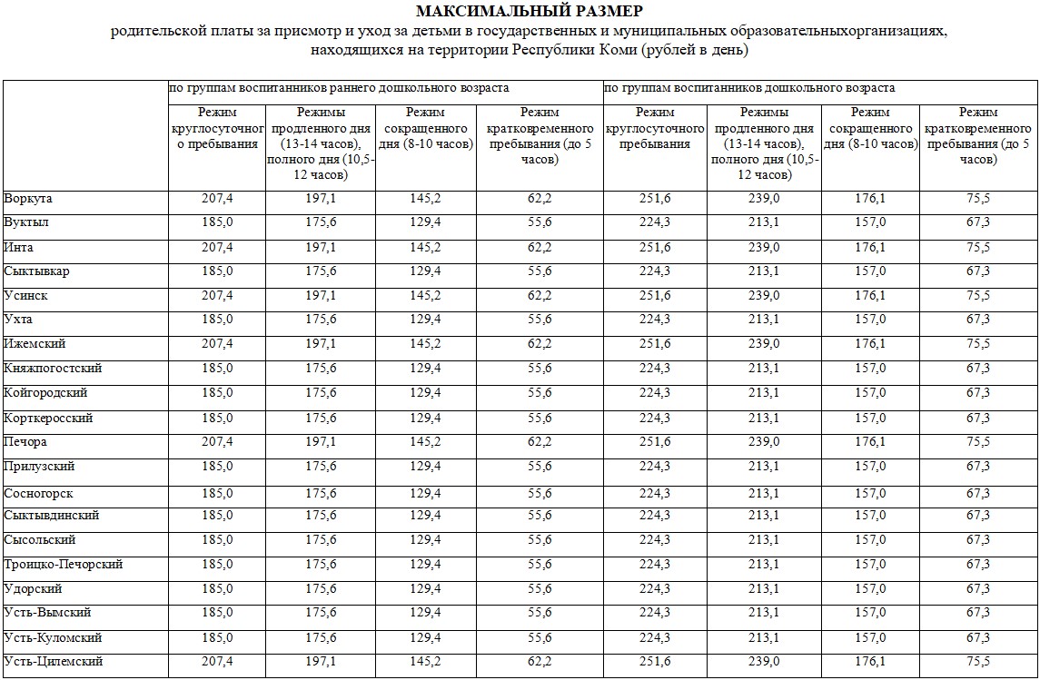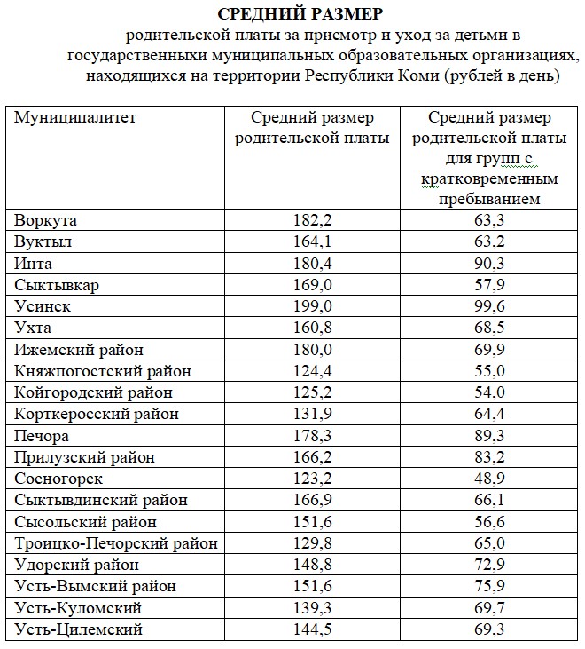 В Коми компенсации на первого ребенка составляет 30% среднего размера родительской платы, на второго — 50%, на третьего и последующих детей — 70%. Эта мера поддержки носит заявительный характер, она назначается родителям детей, в случае если среднедушевой доход семьи не превышает 2,5 кратного размер величины прожиточного минимума.
