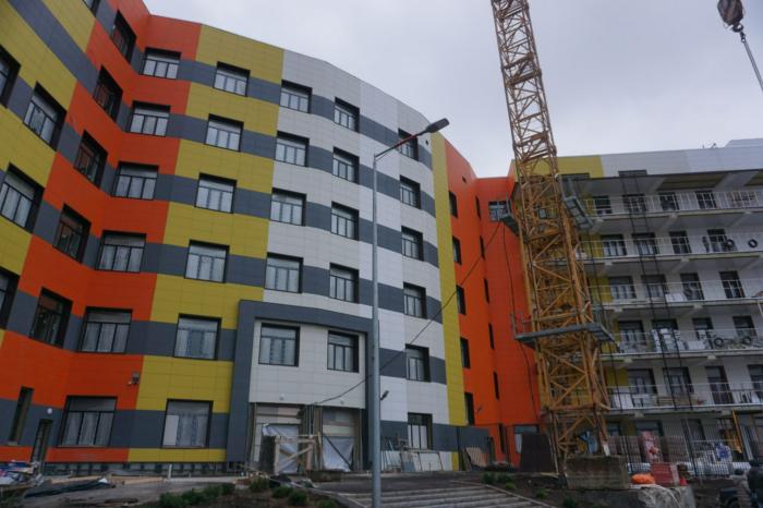 На объекте выполняют монтаж внутренних инженерных сетей, монтаж вентилируемого фасада, отделочные работы, заполнение оконных и дверных проемов, монтаж ПВХ дверей и перил внутренних балконов, устройство монолитных крылец и входных групп, монтаж лифтового оборудования, монтаж дезинфекционной камеры, благоустройство и асфальтирование территории.