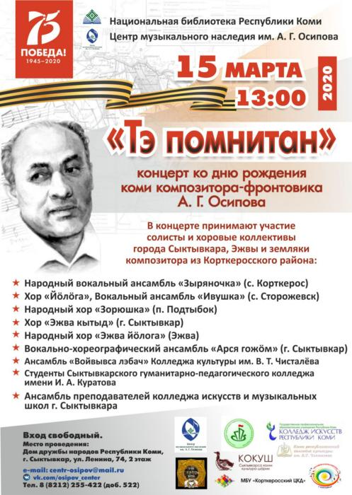 В год празднования 75-летия Победы в Великой Отечественной войне Центр музыкального наследия им. А. Г. Осипова представит большой концерт «Тэ помнитан» из песен первого профессионального коми композитора. В программе выступления солистов, ансамблей и хоровых коллективов Сыктывкара, Эжвы, а также земляков композитора из Корткеросского района. Гостей ждёт погружение в музыку талантливого композитора-песенника, участника Великой Отечественной войны.